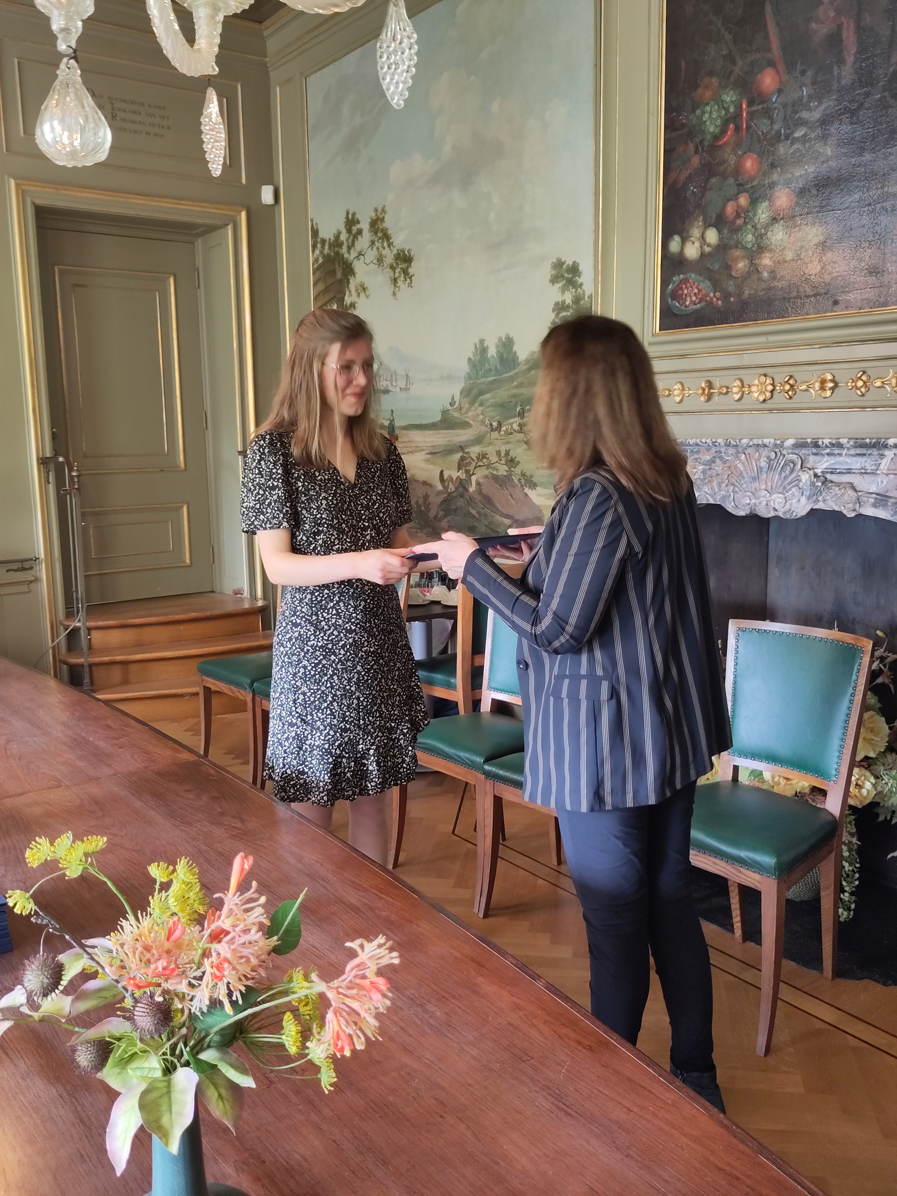 Ondertussen was de ceremonie afgelopen en mochten we naar het zogeheten Zweetkamertje. Zo genoemd omdat studenten of promovenda hier vroeger wachtten op de uitslag van hun examens, en het klamme zweet hen uitbrak. Gelukkig was dat niet meer nodig; wat Willemijn wel mocht doen was een plekje zoeken op de muur om haar handtekening bij de vele anderen te zetten. Alle muren stonden er vol mee, de meesten van onbekenden, maar ook vele hoogheden zoals onze eigen koning Willem Alexander, prinses Beatrix, Nelson Mandela. Zus Irene zocht een poos of ze haar handtekening nog kon traceren, die ze daar 4 jaar geleden had gezet, maar helaas. Uiteindelijk vond Willemijn een mooi plekje, en vol trots schreef ze haar naam op de muur.