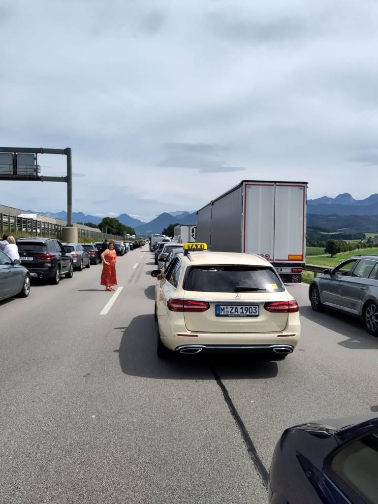 Donderdag legden we twee derde van de afstand af, vrijdag de rest. Dat klinkt relaxter dan het was…man wat een files en drukte allemaal onderweg! Het begon al in Nederland voordat we bij Zevenaar waren. Daarna nog een stuk of vijf keer in Duitsland, met wisselende lengtes en veel oponthoud dus. De meeste stress kwam wel door de routeplanner, van te voren netjes gedownload maar in gebruik zo onhandig! Of ben ik nou zo onhandig? De ene keer veegde ik ‘m weg, dus Wifi opzoeken bij een Rastätte en dan weer laden. De andere keer viel mijn telefoon uit, nog omslachtiger. Eerst telefoon weer op zien te laden en dan voorzichtig openen. Routeplanners slurpen energie, en ze leiden je niet eens altijd op de meest handige route. Dwars door München heen bijvoorbeeld. Qua kilometers vast wel het kortste,maar Gerard ergerde zich groen en geel. Nog erger was de file waar we we na een stresserige rustpauze inschoven. Eerst reden we nog stapvoets, terwijl de ene na de andere wagen van de Rettungsdienst langsscheurde (Feuerwehr, Polizei, Amulanz). En toen kwamen we allemaal stil te staan. Een taxichauffeur voor ons stapte mopperend en scheldend uit, en al gauw volgden er meer. Het was warm en de bergen lokten in de verte, maar ons reisschema kon de prullenbak in.
